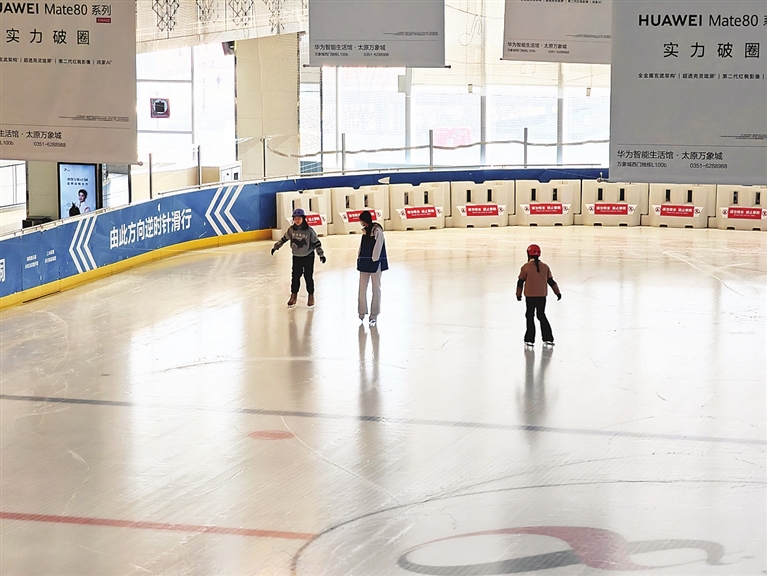 随着我市冰雪经济的发展,越来越多的市民热衷于冰雪运动。图为1月11日,万柏林区长兴街一大型滑冰场内,市民利用闲暇时间体验滑冰乐趣。 郭苑甫 摄
