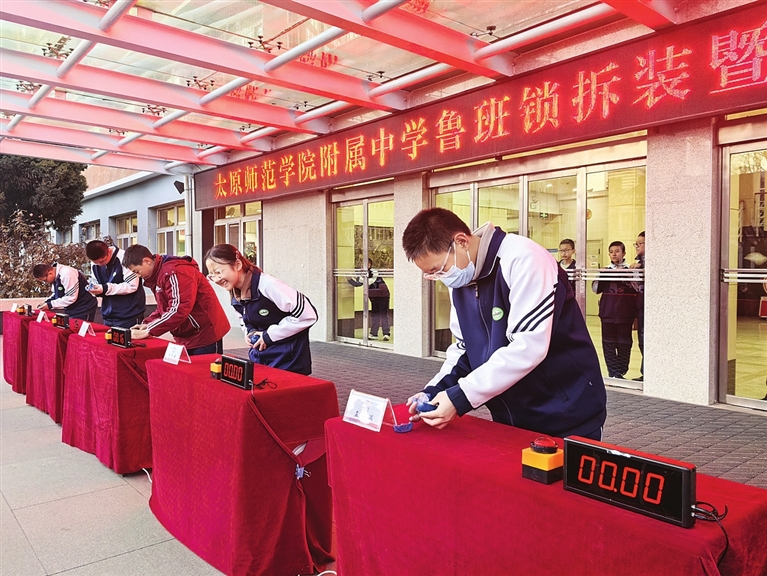 学生们分组进行预选赛,对由6根木柱组成的鲁班锁进行限时组装,现场气氛紧张而有序。根据规则,在规定时间内成功完成组装且结构稳固者晋级。经过激烈角逐,6名同学脱颖而出,进入最终决赛。决赛环节难度升级,不仅要求快速组装,还需完成对“足球锁”的拆卸任务,综合考验选手的手速与空间思维能力。