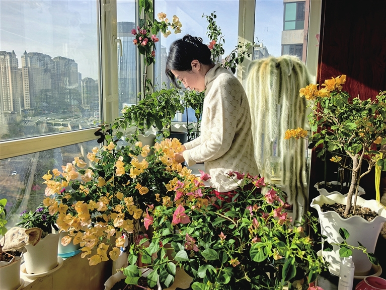 49岁的吴荣花住在金阳南路1号院,在阳台上养了不少绿植花卉。在她的精心打理下,花开正艳、生机盎然。几盆三角梅的花色不同,每一种的颜色都很饱满,玫红、艳粉、浅紫的花瓣簇拥枝头,美不胜收。一盆九尾狐多肉植物摆在高处,毛茸茸的“尾巴”垂落下来,透着一股娇媚及绚烂。
