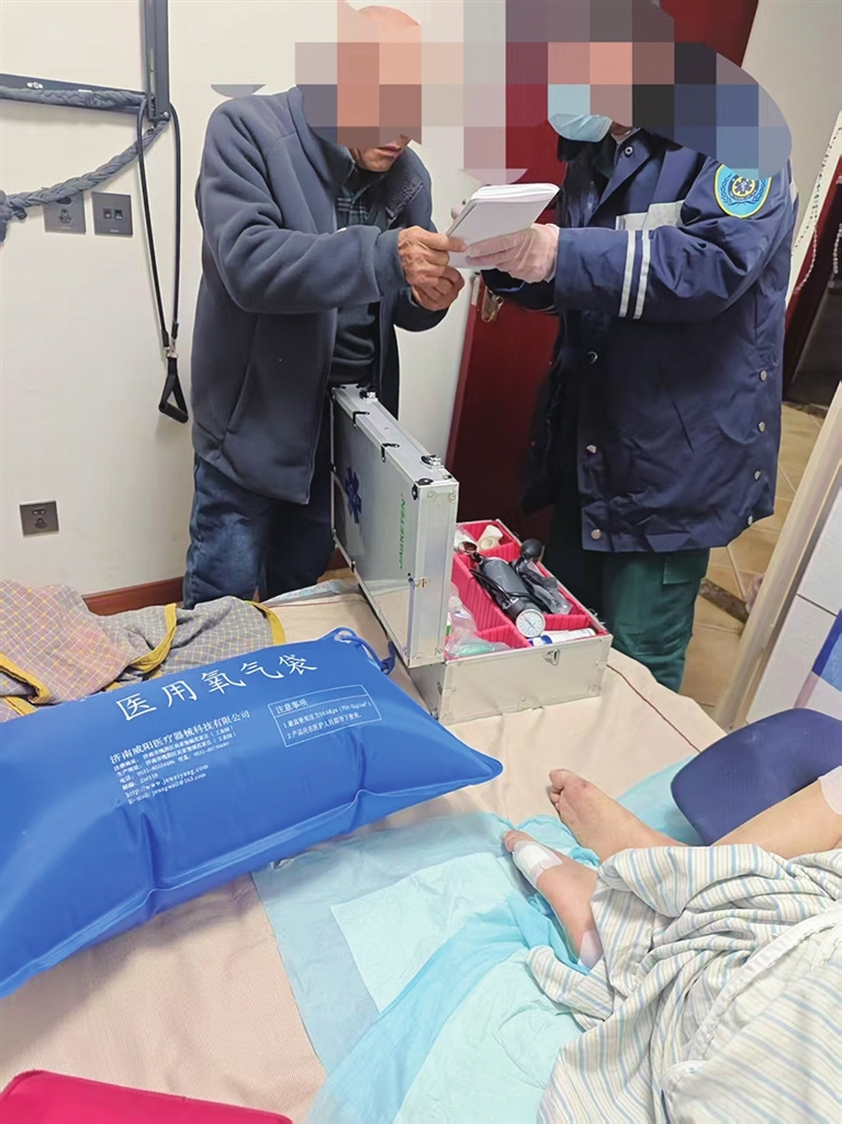 转运途中,血氧监测、心电监测设备规律作响,张超、闫星时刻关注着患者的生命体征。同时,在纸上写下“别紧张,马上到医院,一切正常”,安抚着随行家属。