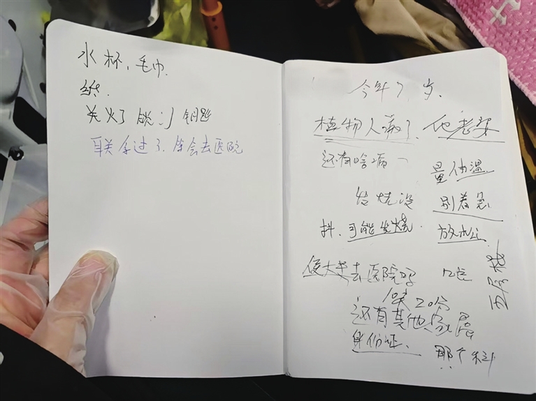 此时,闫星看出了家属的慌张与手足无措,他快速在纸上写下“身份证、水杯、毛巾、关火、锁门、钥匙”等一连串必备提醒。