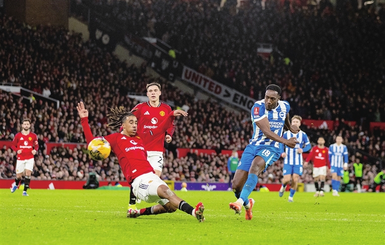 1月11日,布莱顿队球员维尔贝克(前右)在比赛中破门。当日,在英国曼彻斯特进行的2025-2026赛季英格兰足总杯第三轮比赛中,曼联队主场1比2不敌布莱顿队,无缘32强。 新华社 发