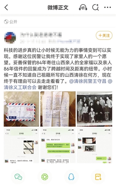 当王守昌将找到亲人的好消息告知罗先生时,电话那头传来了难以抑制的激动声音。“科技的进步真的让小时候无能为力的事情变得可以实现。感谢民警让我终于实现了家人的一个愿望……小时候一直不知道自己祖籍所写的山西清徐在何方,现在终于有理由可以去走走看看了!”罗先生第一时间在微博上写下自己的心情,并向“清徐民警王守昌”表达谢意。