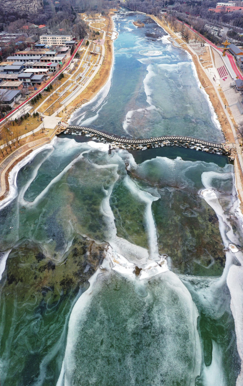 1月15日,老龙头景区内,晶莹剔透的冰花在汾河河面上伸展,形成美丽图画。 牛利敏 摄