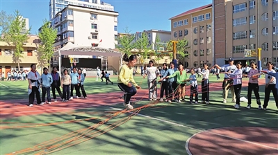 在冬日的夕阳下,孩子们拿起跳绳,纷纷展示自己的“绝活”。绳子在学生们的腿上缠绕又迅速解开、凝成花结几度变换、飞出手中又回到手里,节拍、音乐、翻飞的绳子,共同奏响桃南小学跳绳运动的青春乐章。
