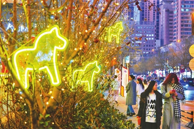 1月18日,小店区体育西路道路两旁的树上悬挂起以“马”为主题的装饰灯串,营造出浓厚的迎春氛围。 王韵菲 摄