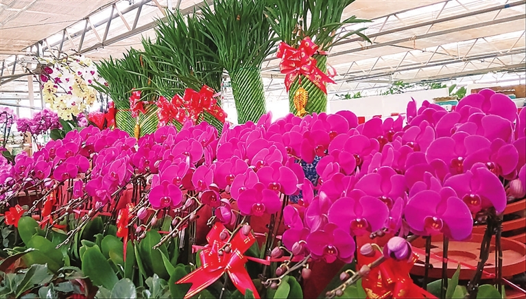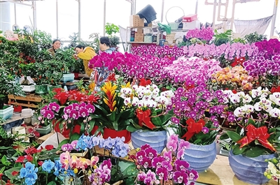 与鑫龙腾一样,各个花卉市场都迎来了销售高峰,商户们忙得不亦乐乎。场内,修剪花枝、打包鲜花,动作有条不紊;场外,盘点出货、装车发车,“微信/支付宝到账xx元”。为了增添浓郁年味,更为了招揽顾客上门,不少商户还为年宵花量身打造特色造型,点缀小巧玲珑的红灯笼、中国结等装饰,让鲜嫩的花植更添喜庆氛围。蝴蝶兰搭配冬青、金桔组合银柳,不同花卉的创意搭配,衍生出“招财进宝”“步步高升”“阖家团圆”等美好寓意,格外讨喜。