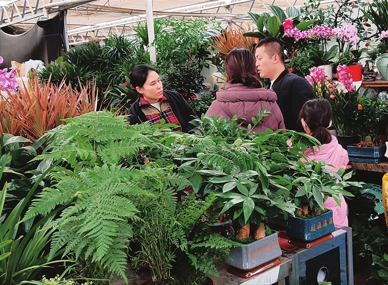 走进晋源区鑫龙腾花卉市场,各色年宵花琳琅满目、争奇斗艳。娇艳欲滴的蝴蝶兰、火红喜庆的北美冬青、硕果累累的金玉满堂错落摆放,每一盆花卉都承载着人们对好日子的美好期许。市民们穿梭于高高低低、大大小小的花架之间,或驻足端详、赏花姿闻花香,或顾盼生姿、手机定格“人面桃花相映红”。更多人围在商户身旁,认真咨询花卉养护小窍门。市场内挑选、议价的身影随处可见,人声鼎沸,一派红火热闹的景象。