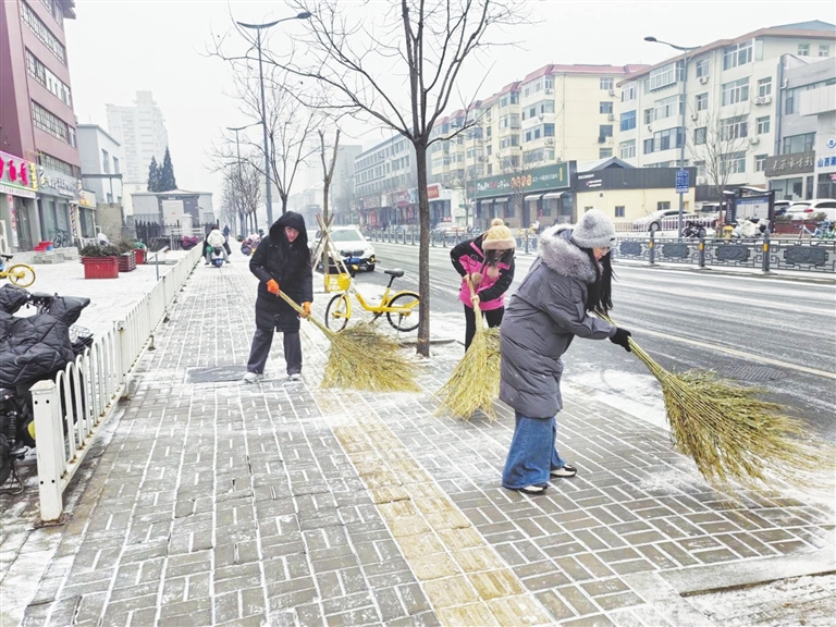 桃园南路第二社区、劲松社区、海东社区的工作人员也迅速到岗,全面开展扫雪除冰。大家分工协作,重点清理主干道、背街小巷及居民院落,确保居民出行安全畅通。