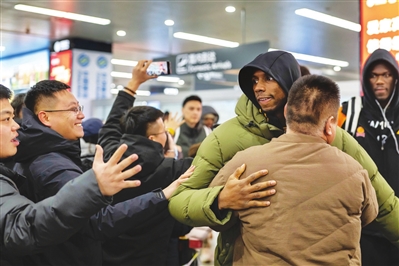 1月25日中午,山西男篮客场不敌广东队后,乘飞机抵达太原武宿国际机场,数百名球迷自发前去接机,场面热烈温馨。图为山西男篮外援迪亚洛与球迷拥抱。 王韵菲 赵新平 摄影报道
