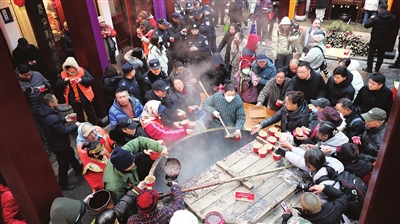 1月26日,农历腊月初八,中华傅山园举办了丰富多彩的民俗活动。市民们品腊八粥,观锣鼓、舞龙,感受传统文化魅力。图为市民免费喝腊八粥。