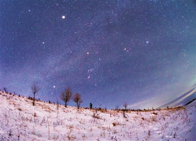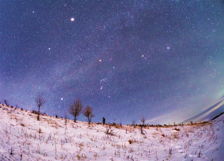 数九寒天,中国最北省份黑龙江省迎来冬季星空观测黄金期。当夜幕降临,群星闪耀如钻,星空中的“冬季大三角”与“冬季大钻石”清晰可见,猎户座天顶高悬。偶现的北极光在星空轻舞,为这幕天地交织的盛景增添了灵动。璀璨星空与冰雪大地交相辉映,铺展开一幅静谧而震撼的星光冰雪画卷。