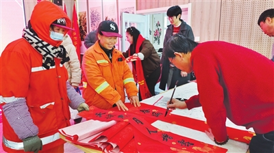 活动现场,暖意浓浓。白发苍苍的老年书法爱好者笔力遒劲,沉稳的中年书法爱好者运笔娴熟,充满活力的青年人则创意频出。大家各展所长,笔走龙蛇间,寓意吉祥的“福”字和春联跃然纸上。受邀前来的环卫工们静静围在一旁,专注地看着书写过程,脸上洋溢着幸福的笑容。
