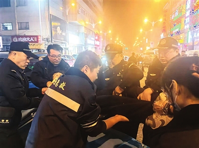 1月26日晚9时20分许,桃园派出所民警、辅警出警行至桃园路路段时,发现前方道路发生交通事故,一辆汽车与电动自行车发生碰撞,骑车男子因撞击摔倒在地,身体多处受伤,现场车辆缓行,围观群众逐渐聚集。几乎同一时间,刚刚完成警情任务返回的邢家社派出所民警、辅警也路过现场。两队人员目光交汇间便达成救援共识——救人为重,再保畅通。