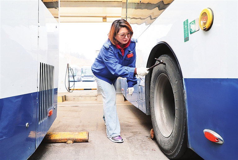2月1日,太原公交集团第三分公司五车队在松庄停车场开展节前车辆安全检查工作。图为五车队81路公交车让驾驶员冉孟谣在认真检查车辆。 张昊宇 张雪娇 摄影报道