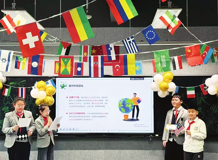 六年级“青少年模拟联合国”现场,学生们身穿正装,化身各国与会“代表”,围绕人工智能、新能源发展、生物技术应用等全球议题,展开有模有样的磋商与演讲。大家在话语交锋中尝试理解不同国家的立场与关切,尽显少年担当。