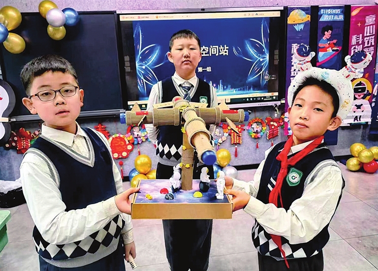 “希望通过这一阶段学习,能在科技领域让孩子们找到自己感兴趣的项目,深入了解和探索未知世界。”该校的副校长张芳说。围绕“科创”主题,学生们尽情挥洒创意,科技小发明、创意画作、AI动漫、科幻篇章等作品,尽显童真巧思。
