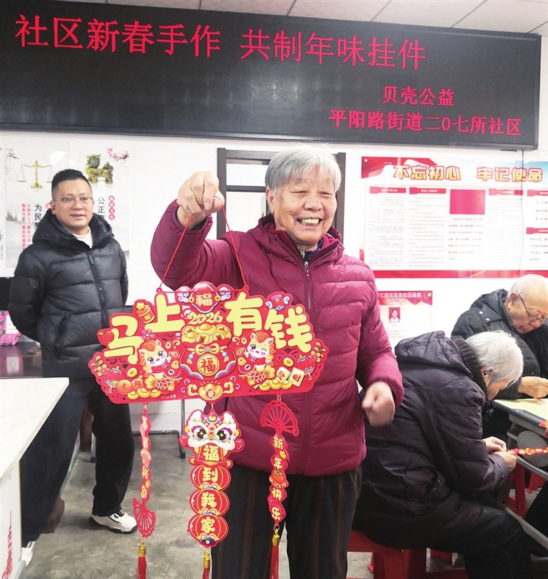 一双双巧手下,原本普通的材料变成寓意吉祥的新春挂件,大家举起成品合影留念,红彤彤的春节挂件映衬着一张张笑脸,浓浓的年味蔓延至整个社区。