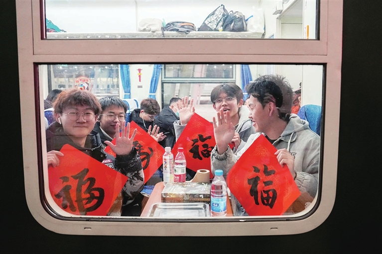 2月2日凌晨,在北京西站,来自九江学院的大一学生缪新鹏(右二)和三位高中同学一起乘坐K4069次列车回江西老家过年。他们目前分别就读于内蒙古科技大学、九江学院和四川农业大学,相约在北京一起游玩后,共同返回老家。