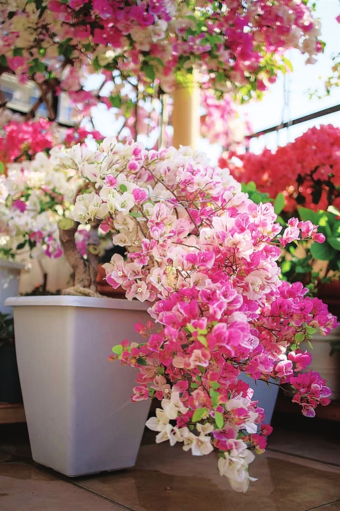 三角梅原产巴西,是一种藤状灌木,地栽的植株能长到十几米高,所以能攀援到墙壁上。如今它在我国南方已是寻常景致,就连北方的太原,也能在温室里寻到盆栽的身影。三角梅有很多别名,由于其花朵形似杜鹃,每到花期,如火如荼,色彩绚烂,故名“簕杜鹃”。此花有3片像花瓣一样的苞片,苞片并不是花,火柴棍似的花蕊才是它的花;它的花很小,开在细长的花蕊上,而它的观赏价值正是那苞片,所以也称为“叶子花”。三角梅的色彩极为丰富,艳红、玫粉、明黄、素白应有尽有,还有红白、红粉相间的复色品种。它总在冬春时节绽放,生命力格外顽强,也因此被赋予了热情与坚韧不拔的花语。