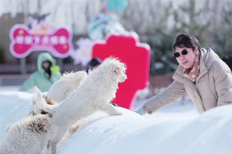 太原康培稻田公园创新推出稻田雪国·狗狗专属乐园,以“冰雪+萌宠”的全新组合,为当地养宠家庭带来别开生面的冬日限定体验。图为2月8日,宠物狗在雪地里奔跑嬉戏。 王韵菲 摄