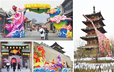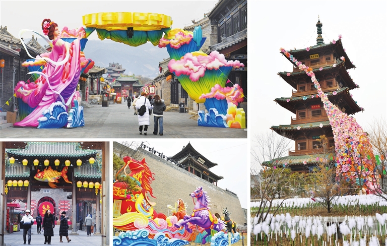 2月9日,太原古县城装饰一新,各种赏心悦目的花灯营造出浓浓的节日氛围。左上图为花灯装饰的东大街;左下图为游客欣赏花灯;中下图为北门内的奔马花灯;右图为一路生花主题花灯。