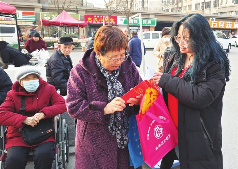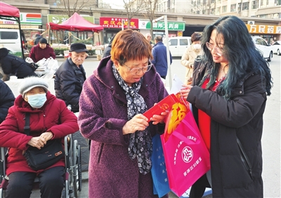 近日,晋源社区工作人员与“和合之家”志愿服务队组成送福小分队深入辖区,上门走访139位高龄老人,为他们送春联;在快递驿站设立临时送福点,为户外劳动者送上春联与暖心包,将关爱切实送到他们身边。 李晓琳 摄