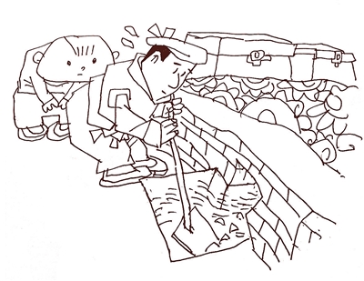 掏火圪劳的圪窦,只要用铁锨将灰渣铲到箩头中,提到街门外的灰渣坡倒掉即可。掏地火圪窦,则费事得多。由于灰渣量大,必须用担杖往外担。而由于圪窦在地面以下,人若站在地面上,由于角度问题,越往下掏铁锨便越不好使。而若人下到圪窦内,由于空间有限,铁锨同样不大得劲。我们村曾种有大片苇地,故家家都有一把砍苇地镢子。这种镢子的一个特点,就是镢头刃宽,约有六七寸,而镢头与镢把差不多呈90度。掏地火圪窦时,它就派上用场了。人站在地面上,镢头伸下去,就可轻松将灰渣勾上来。这样,用它和铁锨配合,圪窦内的边边角角就都能掏干净了。一个圪窦,大约要掏七八担灰渣,掏完了,天也就大黑了。