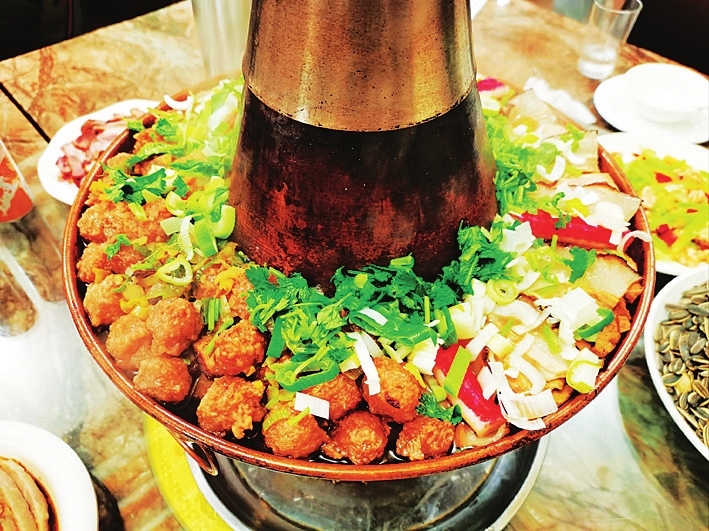 铜火锅端庄大方,且具仪式感。可是铜火锅并非家家必备,还要用木炭作燃料,总是烦琐。现在许多人家会选择在餐桌上放电磁灶加一个金属的汤锅。我们家更简单,把火锅的食材事先放在燃气灶上炖熟,适时端上来就好。