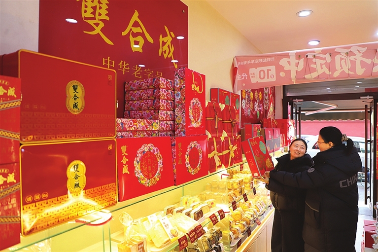 随着春节临近,各种传统糕点迎来销售旺季。图为2月13日,在双合成上马街店,众多市民挑选糕点。 张昊宇 程文娟 摄影报道