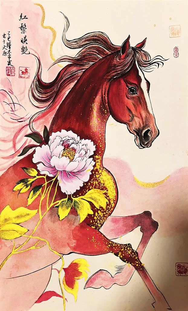 董霞的《红鬃映艳》将奔腾的骏马与盛开的牡丹结合在一起,画面热烈喜庆,寓意着龙马精神和花开富贵。