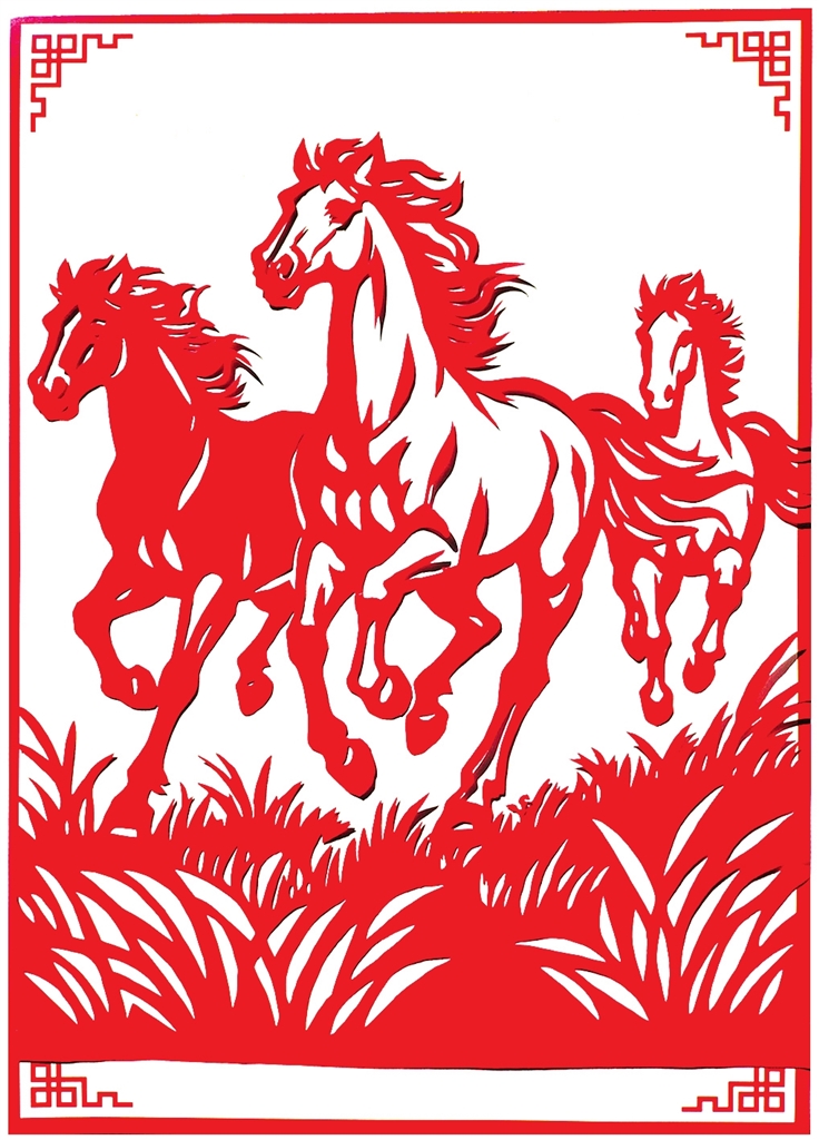 剪纸作品里,邓原珍的《碧野驰骏》格外生动。三匹骏马在红纸上奔腾,线条洒脱有力,仿佛能听到哒哒的马蹄声,寓意着马到成功。