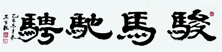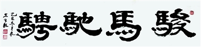 王在根的书法《骏马驰骋》,四个大字写得苍劲有力,气势十足,表达了一往无前的决心。