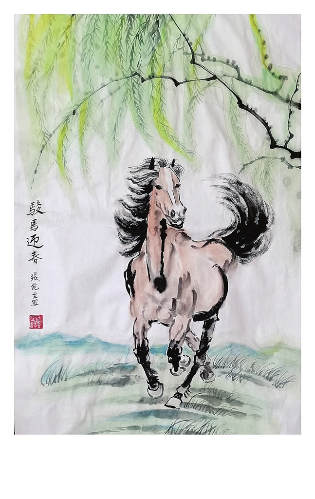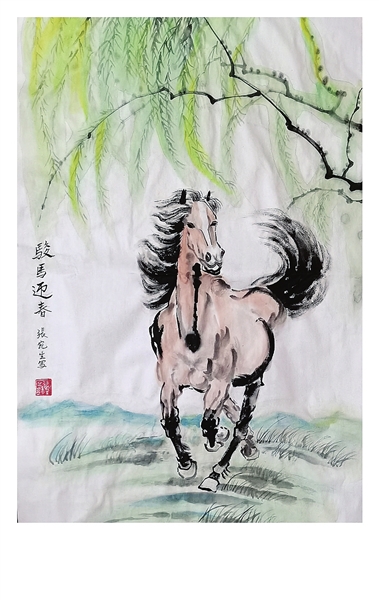 张宛生的《骏马迎春》中,一匹精神抖擞的骏马奔跑在泛起新绿的田野上,让人感受到春天的气息和无限的希望。