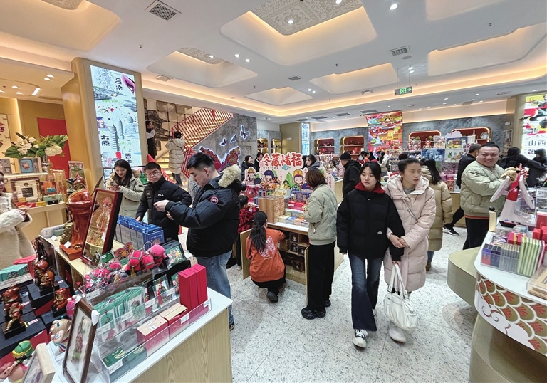 春节假期,我市具有地方特色和历史积淀的文创产品受到外地游客的热捧。图为2月26日,钟楼街一家文创店内,不少游客正在挑选商品。