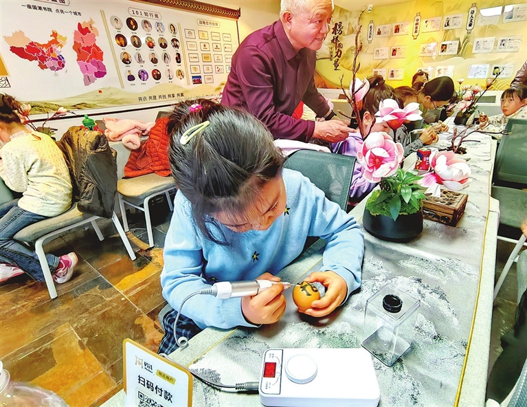 位于柳南的思贤坊岳家匠蛋雕研习中心内,市工艺美术大师岳利民细致讲解了蛋雕的历史渊源、技艺要点与创作技巧,手把手指导居民们握笔、勾勒、雕琢。在家长的陪伴与鼓励下,孩子们屏气凝神,小心翼翼地握着刻笔,在轻薄脆弱的蛋壳上精心创作。从最初的紧张生涩,到后来的专注投入,稚嫩的小手与精巧的蛋壳相映成趣。