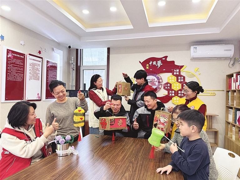 他们与社区工作人员一起构思,对形状进行剪切、粘合,做成了方形、圆形、宫灯形等各式花灯造型。接下来,大家将纸箱刻成镂空状,或在上面张贴彩布、挂穗,一盏盏别致新颖的元宵花灯呈现在眼前。