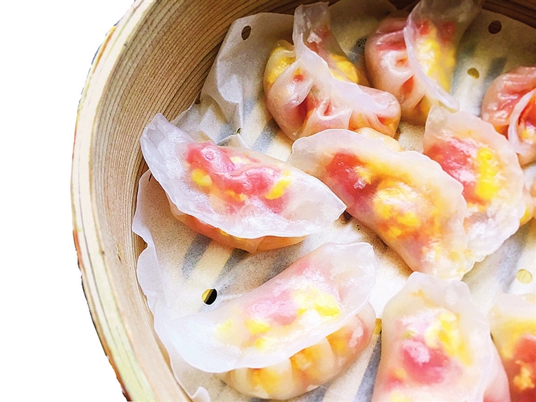 饺子包好后,就是上锅蒸。蒸锅上汽,饺子排列好放入笼屉,大约蒸七八分钟,香喷喷的水晶饺子就可以出锅了。这时你就可以看到一笼晶莹剔透的饺子,也一下子就理解了这饺子为什么叫水晶饺子或玻璃饺子了。吃饺子的蘸料,一碟本地的老陈醋和辣椒油都是必不可少的。