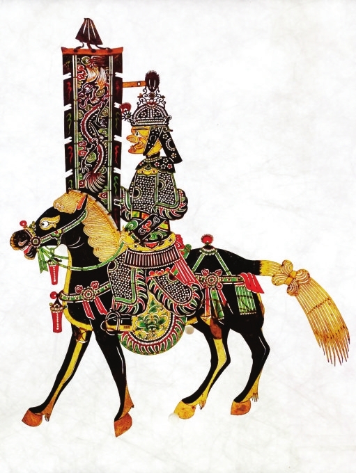 我站在展厅里那幅清代骑马人物仪仗皮影前,久久挪不开脚步。黑鬃马昂首扬尾,蹄尖的金漆在灯光下泛着温润的光泽,马身上的缠枝莲纹与云纹层层叠叠,红绿相间的绦带垂落如瀑;马上的武将头戴鎏金兜鍪,甲胄上的乳钉纹细密如星,手中的大旗绣着游龙戏珠的纹样,龙首高昂,龙须在风里仿佛还在飘动。这不是冰冷的文物,而是活在光影里的英雄,是民间艺人用刻刀与颜料,把《三国演义》里的金戈铁马,把《杨家将》里的忠肝义胆,一寸寸刻进了牛皮的肌理。