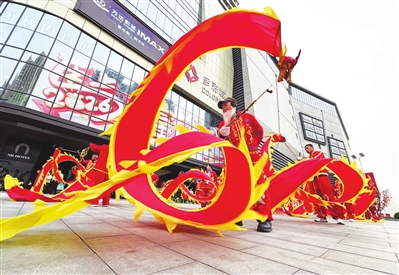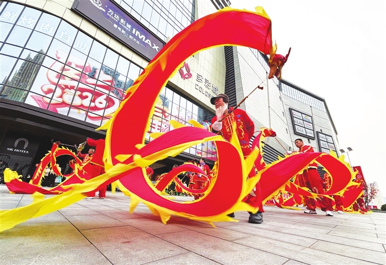 3月3日,省城府东街一商业广场,汾河舞龙队的精彩表演为附近居民带来了一场精彩纷呈的文化盛宴。 邓寅明 摄