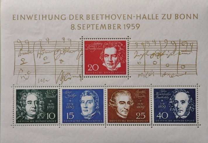 1959年,德意志联邦邮政以贝多芬音乐厅在波恩落成为契机,在9月8日发行了一套小全张,将五位音乐巨匠的肖像定格于方寸之间。