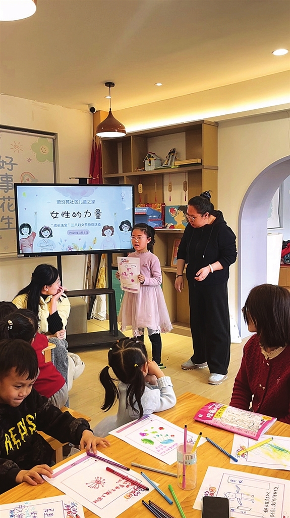 这堂课从一个问题开始:“在你心目中,女性是什么样的?”从3岁到12岁的孩子们答案各异。一个小男孩响亮地回答:“穿裙子的!”旁边的女孩补充:“女生也可以穿裤子。”社工侯飞飞笑着聆听,最后轻声补充:“还有那些‘出得厅堂、入得厨房’的。”