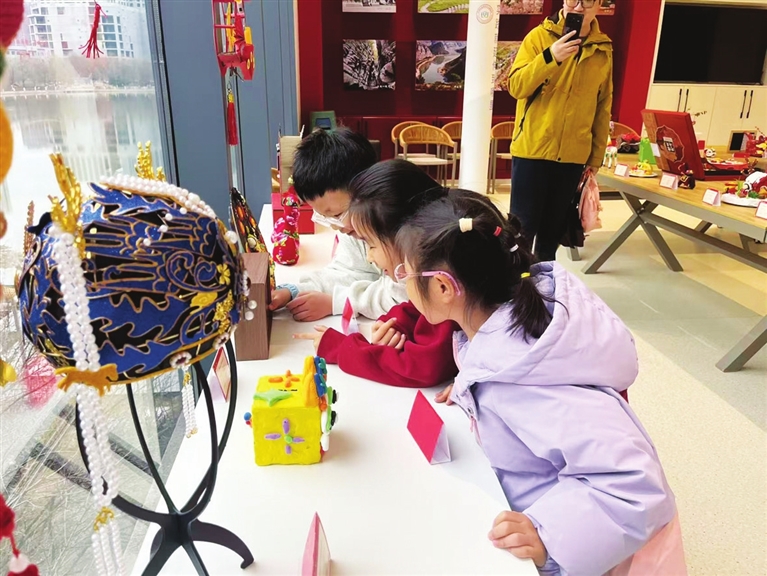 展厅中央,来自气化街小学的三名小伙伴正开启“沉浸式”观展模式。武思阳驻足欣赏《掐丝珐琅荷花》的雅致色彩,米恩赫被充满科幻感的火箭模型《东风-5C》深深震撼,辛怡墨则惊喜地发现《欢喜迎新年》的模型楼里竟然藏着可以点亮的小灯泡,指尖轻触间,温馨的灯光照亮了她兴奋的脸庞。
