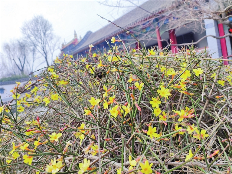 3月5日上午9时许,在狄仁杰文化公园,一群大爷大妈正在翩翩起舞,他们周遭就是大片大片的迎春花。黄色的小花娇艳明媚、毫不矫情,呼啦啦一开一大片。微风轻拂,花枝摇曳,仿佛它们也在随音乐律动,迎接春的到来。
