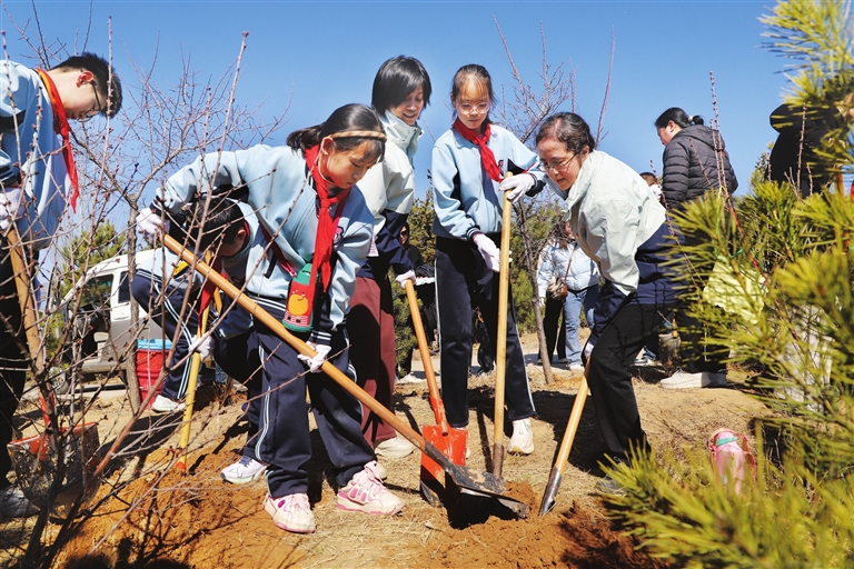 3月11日,迎泽区桃南小学联合老军营街道桃园南路一社区在阳曲县北山植树基地开展“少年劳动植希望”植树节主题活动,增强学生植绿、爱绿、护绿的理念,引导学生积极参加生态建设。