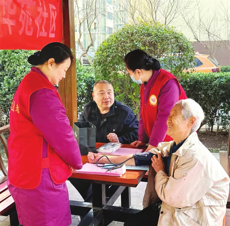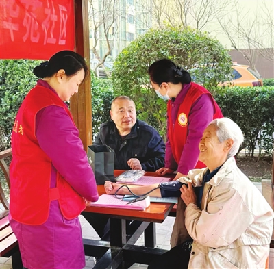 3月11日,文华苑社区与市二院开展爱心义诊活动,社区工作人员和志愿者积极引导、陪护,医护人员为老人测血糖、量血压,仔细询问用药情况,解答高血压、糖尿病、腰腿痛及睡眠问题,耐心叮嘱老人日常养护要点。 周利芳 摄