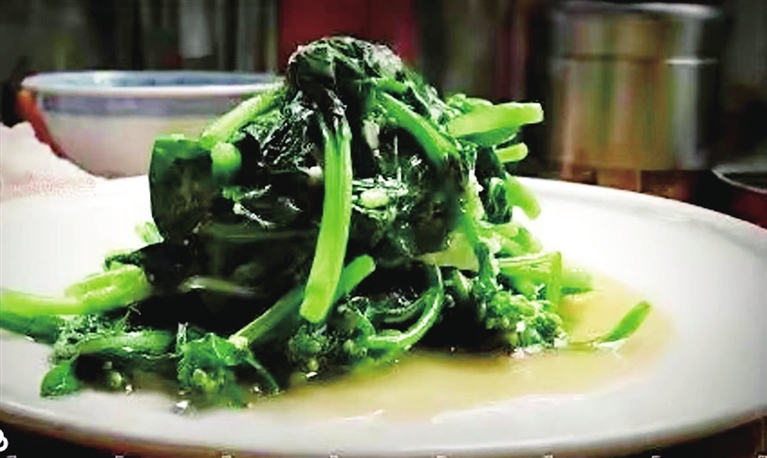 3.先下菜茎翻炒片刻,加少许糖(提鲜)、盐,再放入菜叶,大火快炒,软嫩入味,即可出锅。