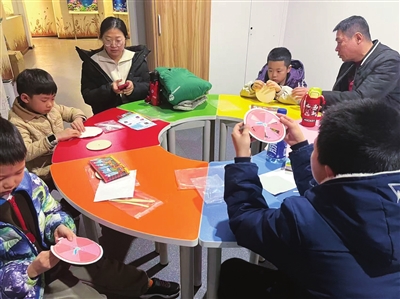 孩子们化身小小非遗传承人,在家长协助下,投入地制作起来。他们先仔细拼接木质底座和细轴杆,搭好灯的骨架;再将印有奔腾骏马剪影的灯身纸小心翼翼地卷成圆筒,认真粘贴固定;最后套上风叶盘,轻轻呵气或推动测试。灯身旋转,骏马仿佛奔腾起来,孩子们不厌其烦地调试着,力求自己的“宝马灯”转得又稳又漂亮。