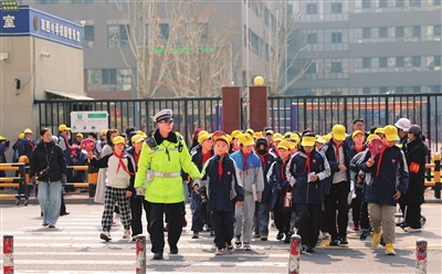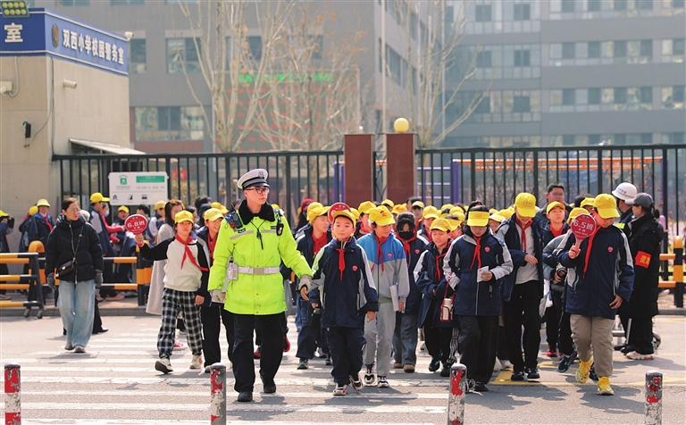 3月16日,迎泽区双西小学校门口,放学的孩子们头戴小黄帽有序离校。交警在路口值守,疏导交通,守护安全,校园周边秩序井然。 郭苑甫 摄