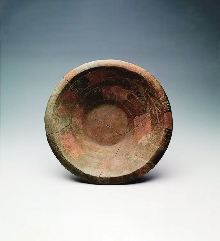 1984年出土于山西襄汾陶寺遗址的彩绘蟠龙盘,距今四千余年,系上古高等级祭祀礼器,亦是目前中原地区所见最早的龙形象实物。器物敞口折腹、平底规整,陶质温润古朴。盘内壁以红白色彩绘蟠龙,龙身盘曲遒劲,鳞纹细密有致;龙首敦厚威仪,口衔嘉禾,集蛇躯之形与神兽之象于一体,神韵沉稳肃穆。此器仅出土于陶寺王级大墓,足见其地位尊崇、意义非凡。